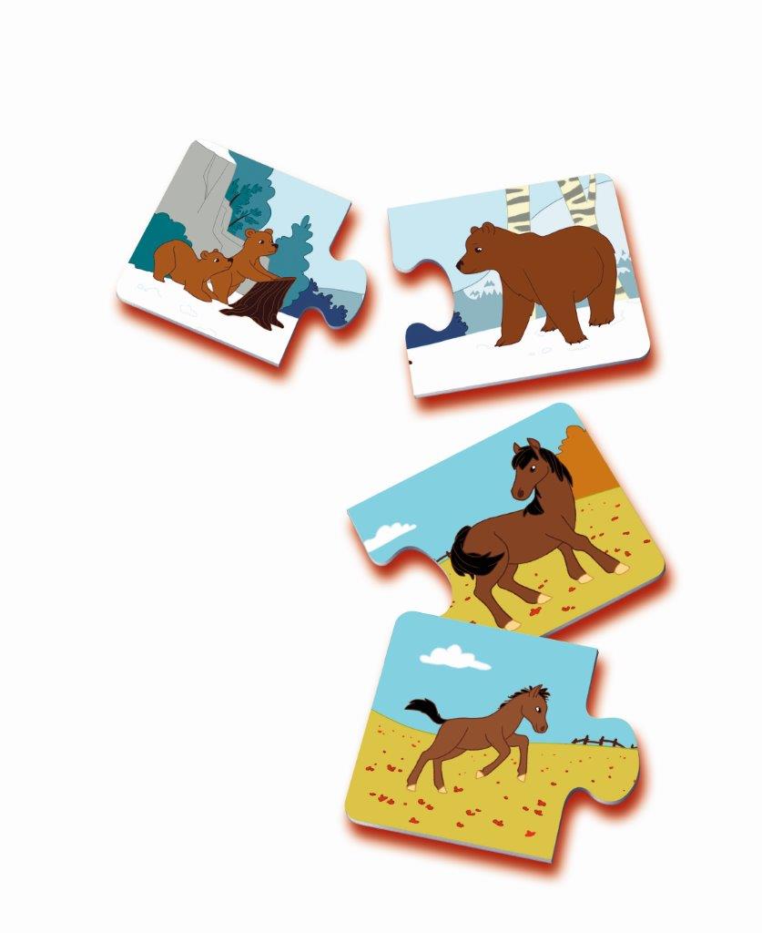The game "Mother and babies" allows children to discover the animals in their environment and to learn their names. In this simple game, children must find the matching babies of 12 mothers. Thanks to the self-correcting puzzle pieces, the child plays to collect the families and can verify himself if he has correctly associated the images. The extra thick cards provide better quality to play and replay again and again! This game encourages observation, development of language, vocabulary linked to animals, and fine motor skills. Content: 12 pairs of puzzle cards and instructions. Age: 2 years and up. THIS IS THE FRENCH VERSION/ VERSION FRANCAISE