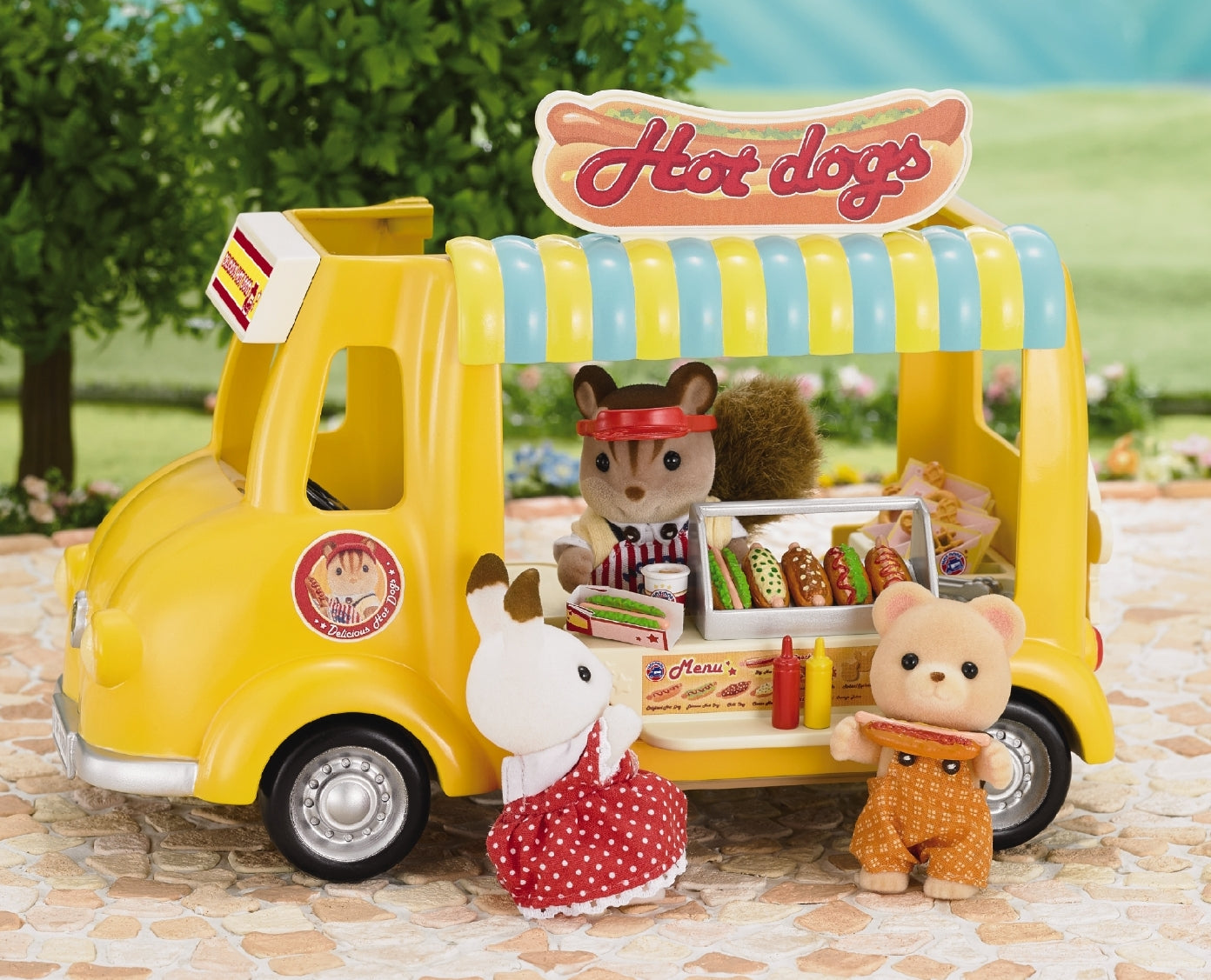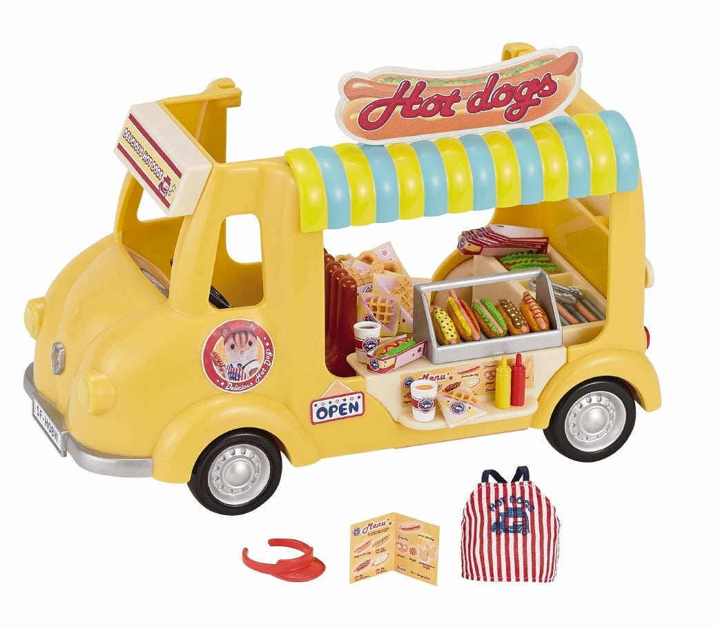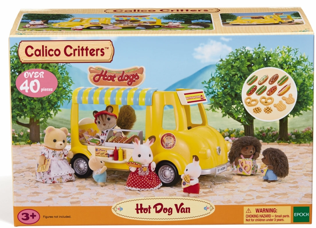 The Hot Dog Van features a grill and counter with a food warmer. Over 30 pieces including yummy hot dogs, pretzels, waffles, fries, drinks and more! The tires and steering wheel rotate. Dimensions: 9 1/2 x 5 x 6 1/2 inches. Critters are not included - sold separately. Calico Critters have endless imaginative play possibilities and are wholesomely realistic so children can share their own experiences and values as they play! Age: 3 years and up