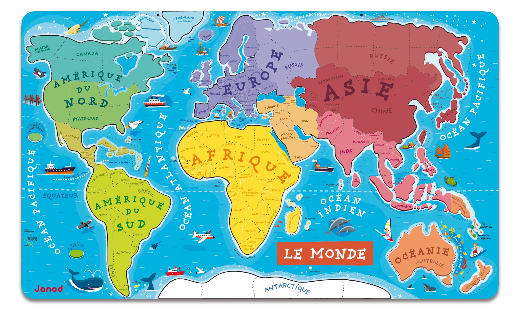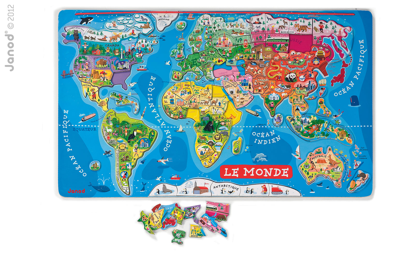 A fun way to learn geography, this colorful and whimsical puzzle with 92 pieces features the world map printed on wood with magnetic backing. Each magnet represents a country or region of the world, with its name, capital and an illustration characteristic of that part of the world. The big magnetic board shows the world with its continents and oceans and the colour used for each region helps you find its place. Have fun completing the puzzle, and at the end you will have a wonderful map of the world, which you can hang on the wall! Dimensions: 77 x 1 x 46 cm. Age: 7 years and up (This is the FRENCH VERSION)