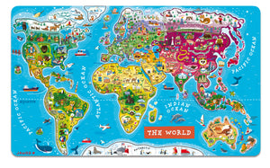 A fun way to learn geography, this colorful and whimsical puzzle with 92 pieces features the world map printed on wood with magnetic backing. Each magnet represents a country or region of the world, with its name, capital and an illustration characteristic of that part of the world. The big magnetic board shows the world with its continents and oceans and the colour used for each region helps you find its place. Have fun completing the puzzle, and at the end you will have a wonderful map of the world, which you can hang on the wall! Dimensions: 77 x 1 x 46 cm. Age: 7 years and up (This is the ENGLISH VERSION)