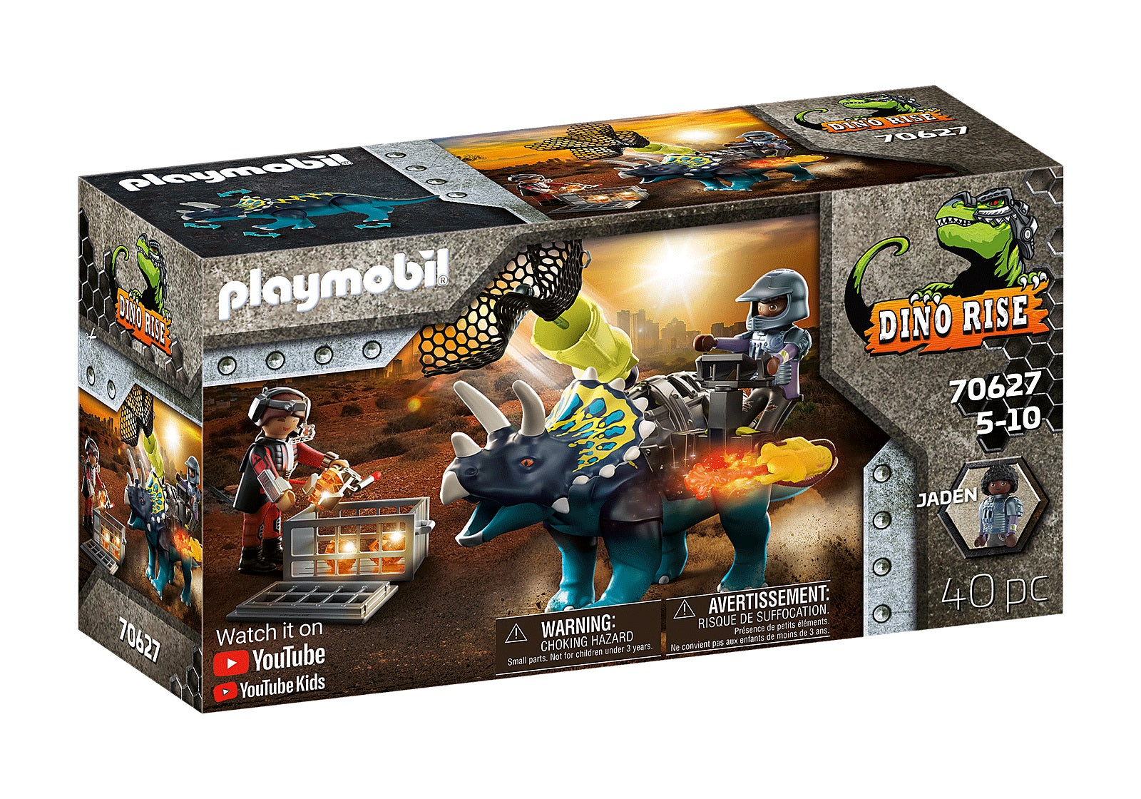 Equipped with a working safety net cannon and removable armour. Jaden can ride the Triceratops. Sometimes the enemy is much smaller than expected, for example a mini robot. The nasty little machines try to scout out the plans of Uncle Rob and the Dino Team unnoticed. But the Dino Team does not let itself be seen that easily. In order to be equipped against big and small opponents, the armoured Triceratops not only has a normal cannon, but also a trap net cannon. If his partner Jaden hurls out the catch net at the right moment, the mini-robots are pinned down and thus immobilised. Strong dino-human power for tricky special missions.
